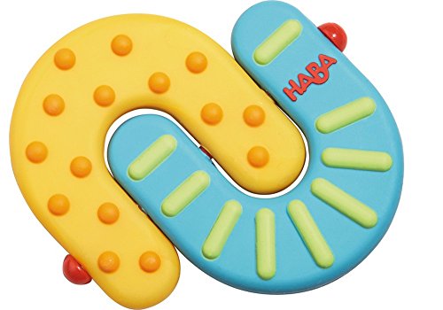 The shape of this clutching toy symbolizes balance, which is what parenting is all about! Little ones will love its soothing texture and the pivoting, flipping feature.;HABA's silicone teething toys are ideal for babies to place them in their mouths and suck on them. The knobs and surface textures feel different and help with relaxation.;Made from food-grade silicone, this teether is BPA and phthalate free. It can be refrigerated and is dishwasher safe.;Measures 3.5 x 3.5 and is suitable for babies from birth. Great baby shower gift!