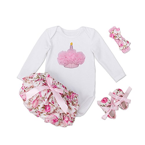 ALLAIBB ベビー服 女の子 長袖 ロンパース ハーフパンツ 花柄 ヘアバンド 靴 4点セット 誕生日 出産祝い ケーキ M