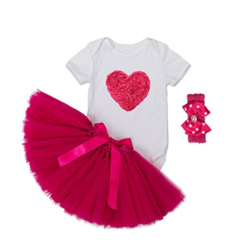 ALLAIBB ベビー服 女の子 半袖 ロンパース チュチュスカート バラ色 ヘアバンド 3点セット 誕生日 出産祝い 愛心柄 M