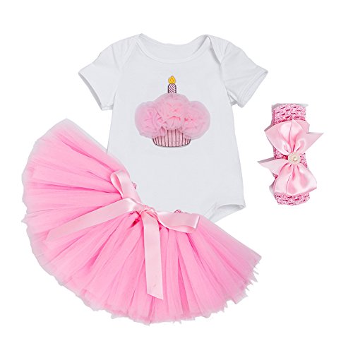 ALLAIBB ベビー服 女の子 半袖 ロンパース チュチュスカート ヘアバンド 3点セット 誕生日 出産祝い ピンクケーキ柄 L