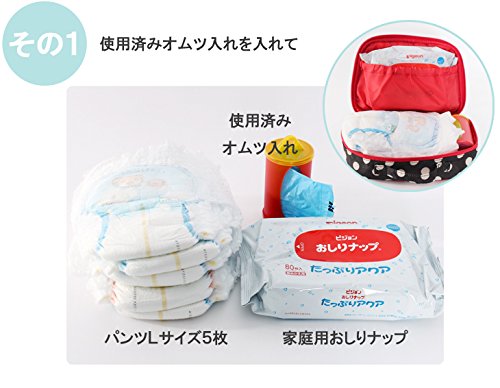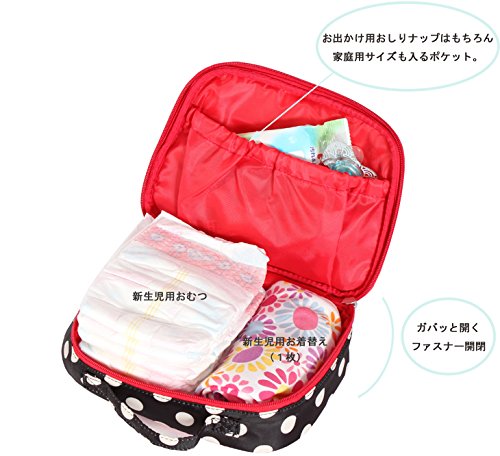 おむつポーチとしては、新生児から一番大きいパンツ型まですべてのステージに対応。内側はナイロン布が張ってあるので、少々の濡れ物を入れても大丈夫。ふっくらフタが膨らむデザインなので、たくさんのグッズを収納することができます。 品質表示 ●素材:ポリエステル
