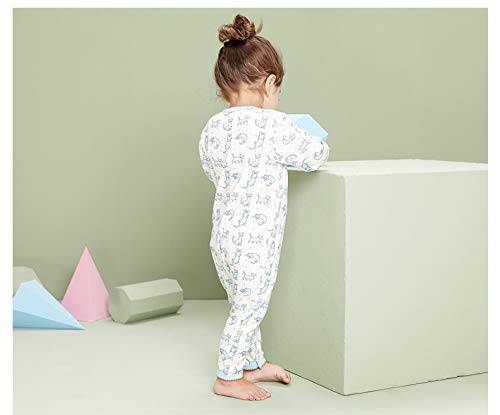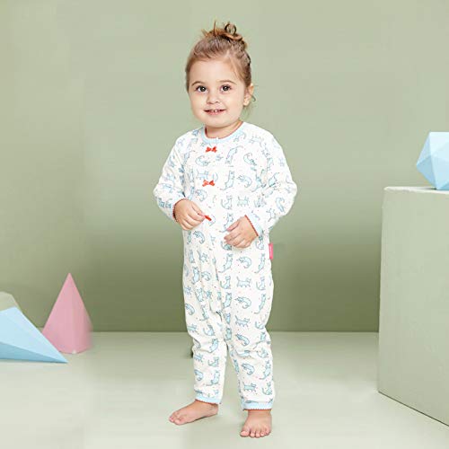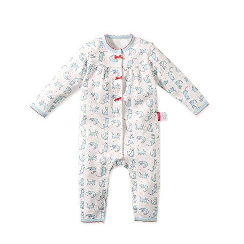 ベビー服 ロンパース カバーオール 前開き 女の子 長袖 猫ちゃん柄 ピコレース コットン100% ブルー 9-12M