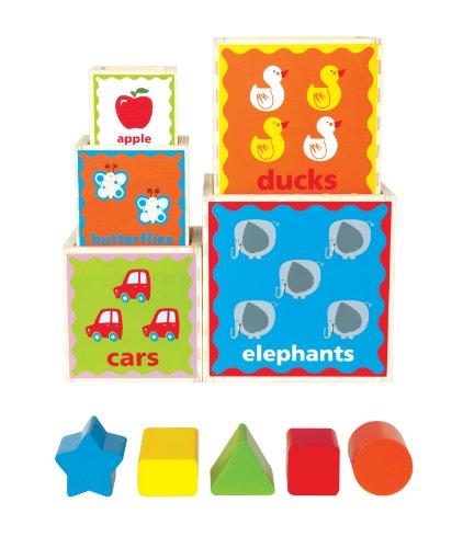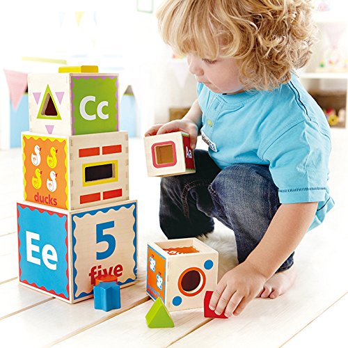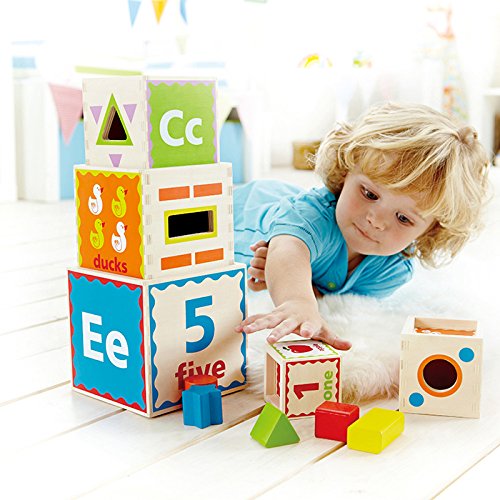 5つの箱には、それぞれ違ったブロックがあてはまる穴、文字、番号、絵、色が描かれていて、箱を重ねたり、積んだり、いく通りもの遊び方ができます。