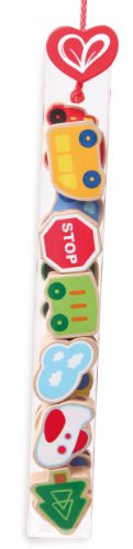 Lacing these wooden vehicles together turns comings and goings into an ever-changing line of traffic. Street-side scenery adds to the story.