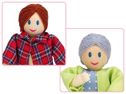 Hape(ハペ)の可愛らしいドールハウス用のお人形6体セットです。 おじいちゃん、おばあちゃん、お父さん、お母さん、男の子に女の子の6人家族のお人形セットです。 仲良し家族のお人形で、ドールハウスでの遊びがさらに楽しくなります♪ 色んなストーリーをつくって遊びましょう! いろんなポーズができるように、お人形の手足は動くようになっています。
