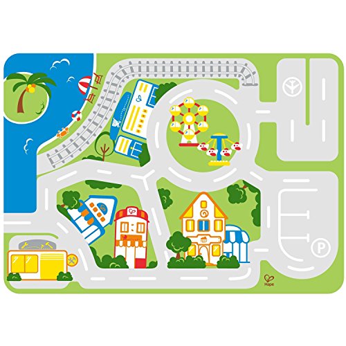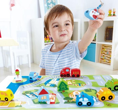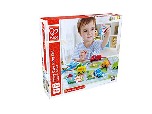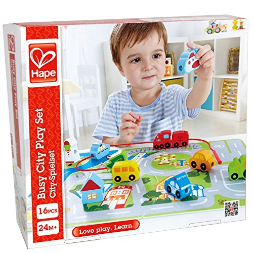 Early Explorer - Busy City Play Set Create a mini city from the ground up with a detailed, 4 piece, felt puzzle mat, 7 vehicles, one tree, one lighthouse, one house, one boat and a string to keep the vehicles in a line. Name the different pieces in the city. Which ones are in your city? Pieces are solid wood with fresh, printed designs. String them together for counting and sorting. Durable child safe paint finish and solid wood construction are hallmarks of Hape toys. Hape's toys stimulate children through every stage of development and help nurture and develop their natural abilities. All Hape products sold in North America meet or exceed all applicable safety standards.