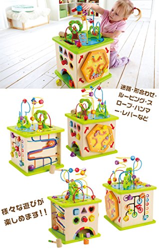 ドイツのおもちゃメーカーHape(ハペ)のたくさんの遊びがつまった箱型木製知育玩具です。 迷路・形合わせ・レバー・飛ぶ動物・泳ぐ動物・ケロケロ鳴くかえるなどが、にぎやかに集まったカラフルな5面アクティビティセンターです。 水性塗料を塗った丈夫なつくりは、何年にもわたって、楽しいアクティビティを提供します。