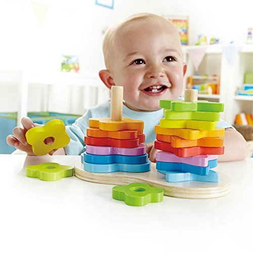 12 months & up. A colorful rainbow of stars and blossom shapes make up this wooden stacking toy. Develops color and shape matching, fine motor and visualization skills. Stacks with or without using base. Double Rainbow Stacker by Hape will create endless possibilities for stacking and sorting. The brightly colored blossom and star shapes can be stacked on the stacking poles. Unique placement of the opening in the shapes allows the stacked pieces to be arranged in spiral patterns. Introduces logic, matching, spatial relationships and critical thinking. Durable child safe paint finish and solid wood construction are hallmarks of Hape toys. Hape's toys stimulate children through every stage of development and help nurture and develop their natural abilities. All Hape products sold in North America meet or exceed all applicable safety standards.