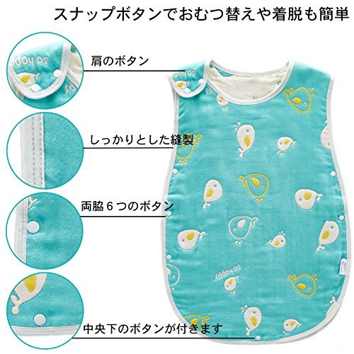 目の粗いものと細いものが重ねる6重ガーゼで作られ、冬には暖かく、夏には通気性がよく、一年通してご利用いただけます。この寝袋で赤ちゃんの安眠とママの安心をお約束します。 肩と両サイドのボタンを開けて、寝袋を開けると、布団としてもご利用いただけます。
