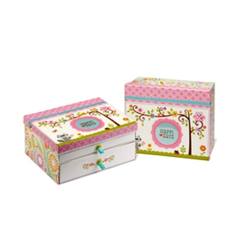 Keepsake Box features special drawers designed to hold hair, photos, announcements and more;Measures 1275 x 1025 x 6 large enough to hold keepsakes and baby book, small enough to store in a closet or under the bed;Happi Baby Girl Design by Dena Designs features adorable taffeta ribbons and 3D decorating embellishments;A great gift for new parents or parents to be;CR Gibson invented the first baby book in 1898, and since then families around the globe have depended on CR Gibson as their provider of memory books, social books, stationery and photo albums