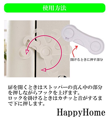 - 【使用方法】本体の真ん中部分を押しながらフックを上げると、扉を開けることが出来ます。ロックする時はフックを下すだけです。カチッとなるまで下ろします。