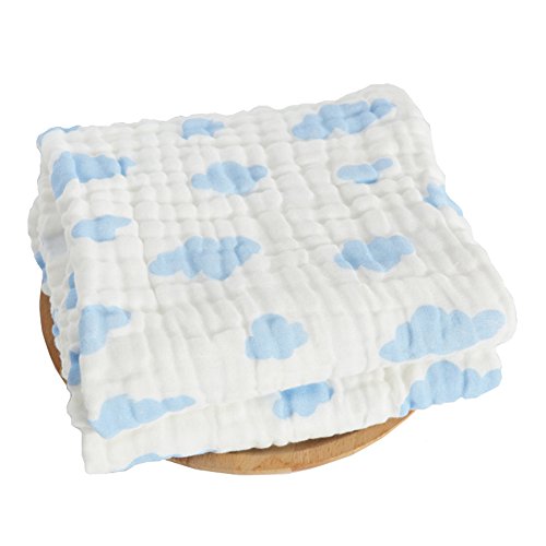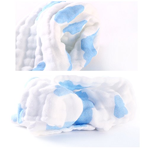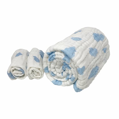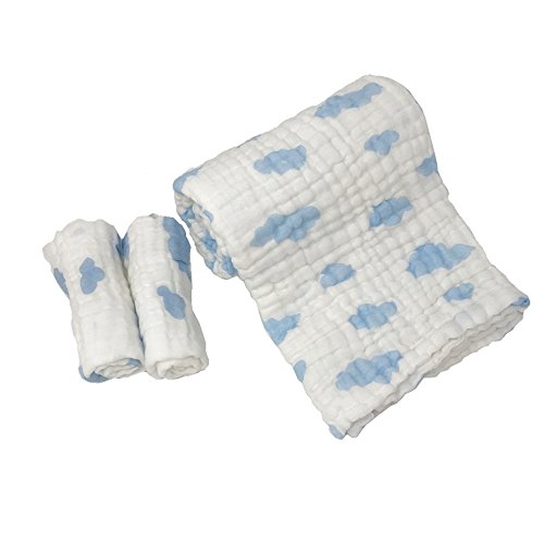 Happy Venture かわいい雲柄 ベビー バスタオルセット バスタオル×1+ウォッシュクロス×2 赤ちゃん ふわふわ6重ガーゼ ガーゼケット おくるみ ブランケット タオルケット 105*105cm 吸水速乾 出産祝い 誕生日プレゼント (ブルー)