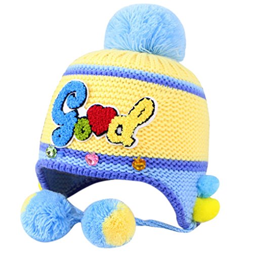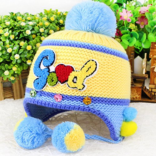Happy Cherry 人気 キッズ帽子 ニット 子供 耳あて 冬着 防寒 暖かい アルファベット ボンボン付き 便利 コンフォート ブルー