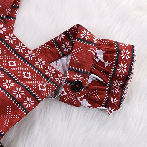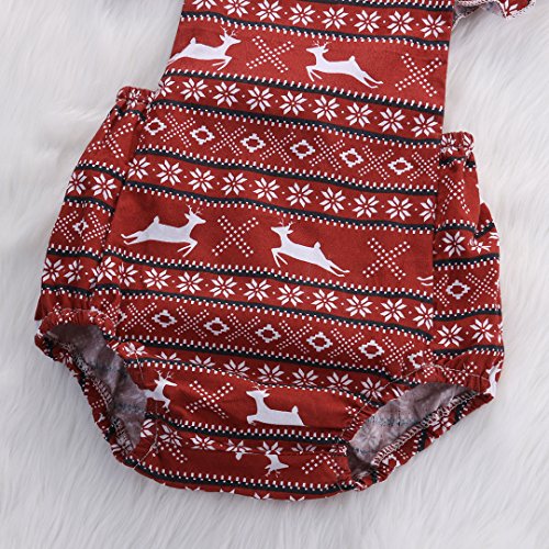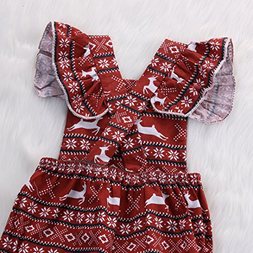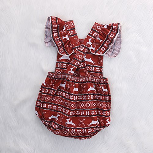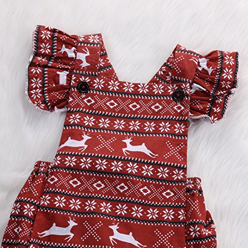 Happyハッピー耳 女の子 ロンパース バックレス 夏 ふわふわ フライスリーブ ノースリーブ パンツ 鹿 雪 プリント 可愛い 赤い 60 70 80 90 (80)