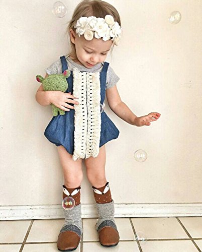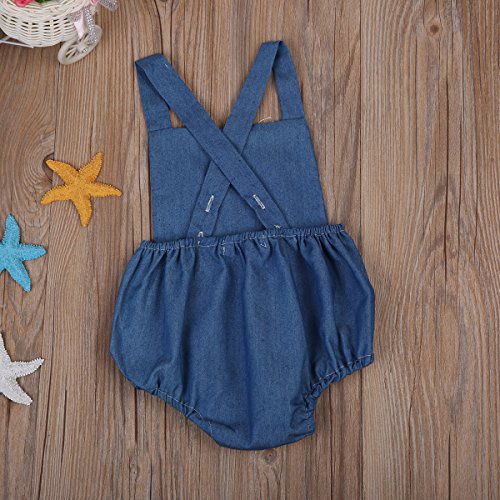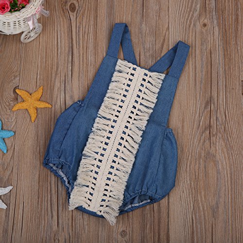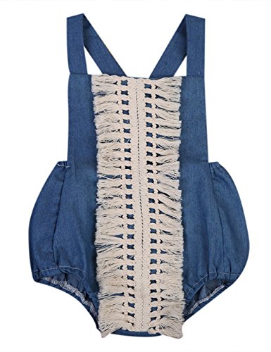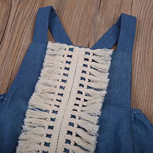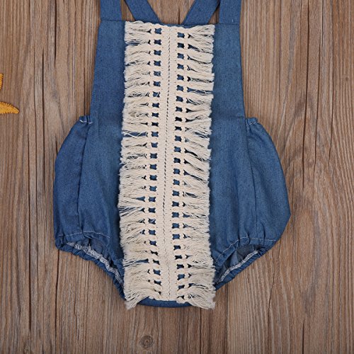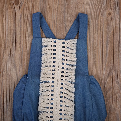 Happyハッピー耳 ロンパース 新生児 ベビー 女の子 夏 ノースリーブ デニム ブルー バックレス タッセル フリンジ 可愛い 70 80 90 100 (90)