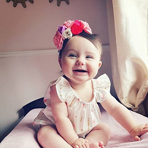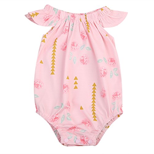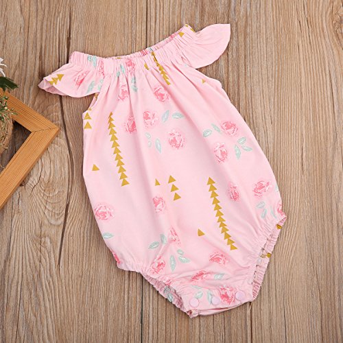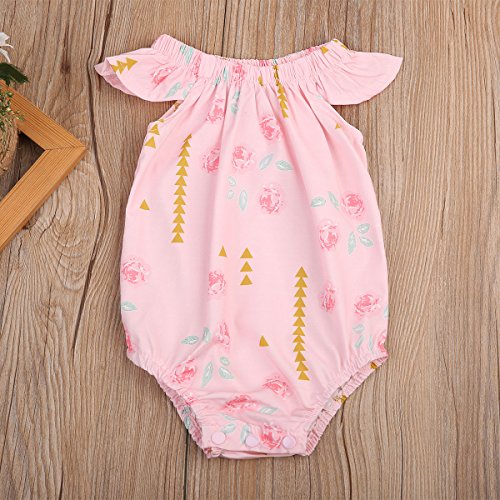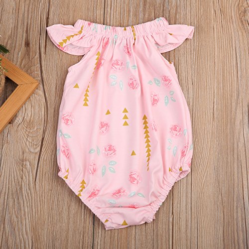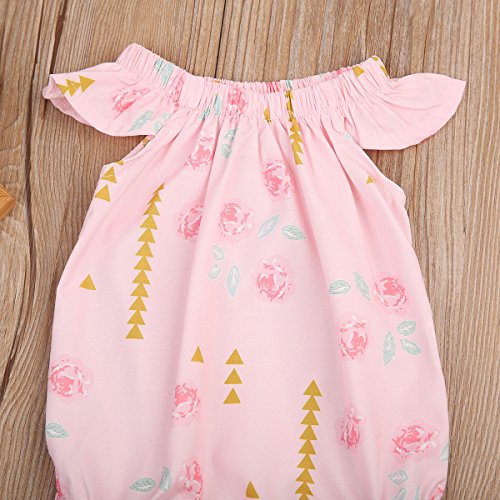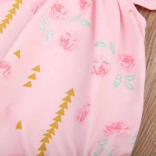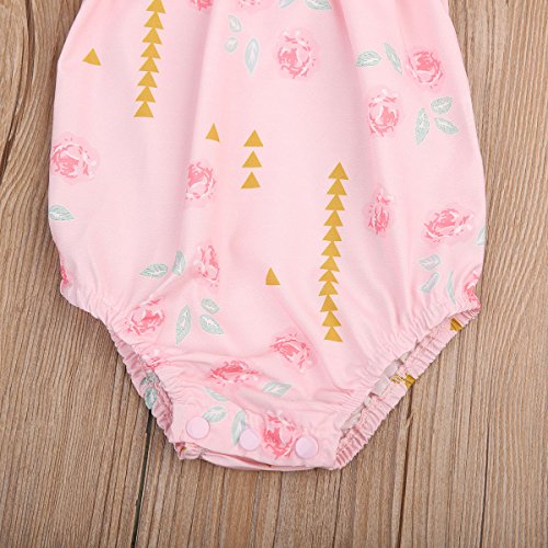 Happyハッピー耳 ロンパース 女の子 花柄 青葉 ふわふわ ノースリーブ 可愛い 夏 スカラップ フリル襟 ピンク グリーン (80, ピンク)