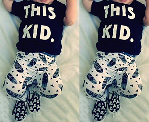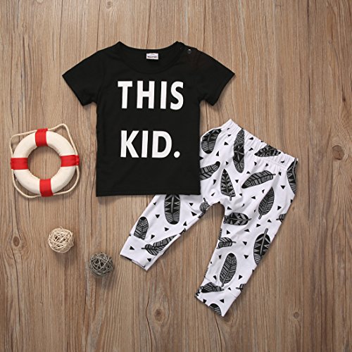 - 【可愛いデザイン】黒い「THIS KID.」英字プリントシャツ+白い羽プリントズボン