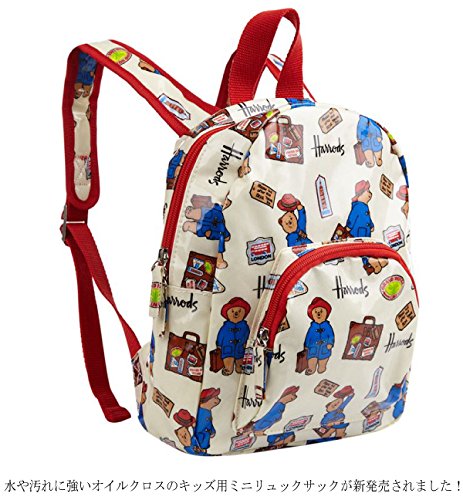 【ミニリュックサックの詳細】 素材:オイルクロスバック 100% PVC coated サイズ:よこ約20×たて約25×マチ約7cm ショルダー幅 3.8cm 長さ:約30cm~50cm 重さ:約230g ◎ハロッズからキッズのミニリュックサックが初登場しました 水や汚れに強いオイルクロス素材。 ファスナー付の外ポケットがありマチもあるので荷物が結構入ります。 ショルダーは長さ調節出来るので1才から4才位までのお子様に。 幅広い共布のショルダーにはクッションが入って背中が痛くありません。中は無地のポリエステル裏地が付いていて扱いやすい。 Paddington Bear柄は大人にも人気なパティントンがバックを持って旅行しています。 1才の誕生日プレゼントに最適です。