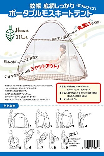 蚊帳 持ち運べる たためる 洗える ポータブル モスキート テント 大型 ダブルサイズ 底網 しっかり チェック柄 開閉ダブルジップ (Harvestmart)