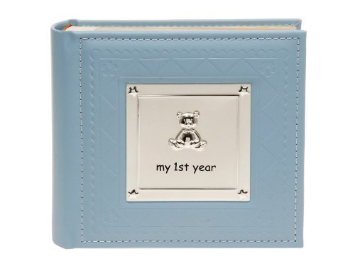 Gorgeous blue leatherette photo album to show photos of your baby's first year off in from Haysom Interiors.;The front cover has a silver plated plaque measuring 3.7 x 3.7. It has an embossed picture of a teddy in the middle, with 'my 1st year' written underneath, and an embossed star in each corner.;The front of the cover also has patterns and flowers embossed on the blue leatherette meaterial to give it a lovely finish.;The album holds 100 slip in 4 x 6 photos with 3 lines under each photo to write a caption. Measures approximately 7.5 x 7.;There is a single rich cream card page as the first page, then every page thereafter is for the photos. These are double sided and rich cream/yellow. The section where the photo will be placed has cute pictures of flowers, teddy bears, sheep, rabbits, chicks and stars in a deeper yellow color.