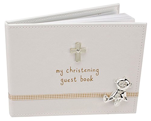ホワイトレザレット"マイ洗礼式"ゲストブックwithシルバーTeddy Bear and Cross by Haysom Interiors
