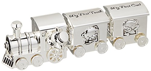 A high quality first tooth and curl set in a silver plated train with two carriages.;Comes packaged in an attractive white lined gift box.;Beautiful little souvenir box to store your baby's first tooth and curl.;Size of train and carriages together is approximately: 7 long x 2 wide x 1.5 tall.;Designed to compliment any nursery with its cute little characters and neutral color.