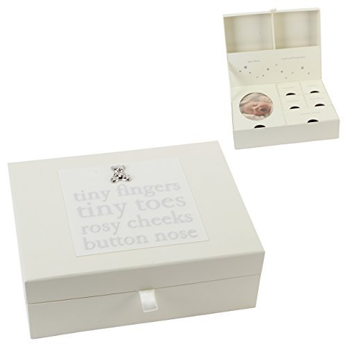 Stunning beige/cream baby wooden keepsake box with silver plated teddy bear from Haysom Interiors.;Tiny fingers, tine toes, rosy cheeks and button nose text on the top of the box.;Opens with a small ribbon, inside there are spaces for first shoes and cards & keepsakes there are then small boxes for treasures, keepsakes, memories, first mittens and precious things.;There is a space for a 3.5 x 5 photograph of the special baby. This item makes for a lovely and thoughtful gift for a new born baby.;The box measures 9 x 7 x 3.5.