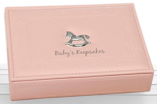 A small and unqiue rectangle baby keepsake box by Haysom Interiors.;The box has a beautiful silver plated rocking horse icon and floral edging.;A perfect gift idea for a newborn baby girl or christening. This comes boxed and tissue paper wrapped.;This keepsake box is made from pink faux leather material, complete with text reading 'Babys Keepsakes' on top.;Keepsake box measurements approximately: Height: 6 x Width: 8 x Depth: 2.