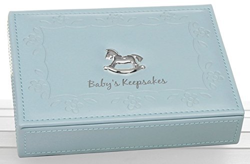 A small and unqiue rectangle baby keepsake box by Haysom Interiors.;The box has a beautiful silver plated rocking horse icon and floral edging.;A perfect gift idea for a newborn baby boy or christening. This comes boxed and tissue paper wrapped.;This keepsake box is made from blue faux leather material, complete with text reading 'Babys Keepsakes' on top.;Keepsake box measurements approximately: Height: 6 x Width: 8 x Depth: 2.