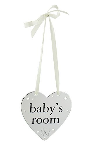 Beautiful silver heart shaped baby hanging plaque by Haysom Interiors.;A great gift to give someone with a new born baby or expecting.;Complete with cream satin ribbon so this decorative piece can be wall hung.;Features wording which reads baby's room in black text.;Overall plaque dimensions are approximately: 3 tall x 3 wide (not including ribbon).