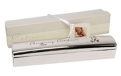 This luxury certificate holder keeps the little baby's precious christening certificate in a safe place.;Silver plated and supplied in a beautiful gift box and bag.;Measures approximately: 9 long x 2 tall.;Finished with black 'Christening Certificate' text on the lid with a bear icon.;This sweet christening certificate holder comes lined with luxury blue velvet lining.
