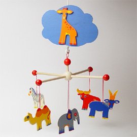 ネジを回すと動物たちがゆっくりと回りながらオルゴールが流れます。 早すぎない回転はベビーベットなどの上に吊るしても赤ちゃんが十分に目で追うことができます。 シンプルなデザインで出産の贈り物としても喜んで頂けます。