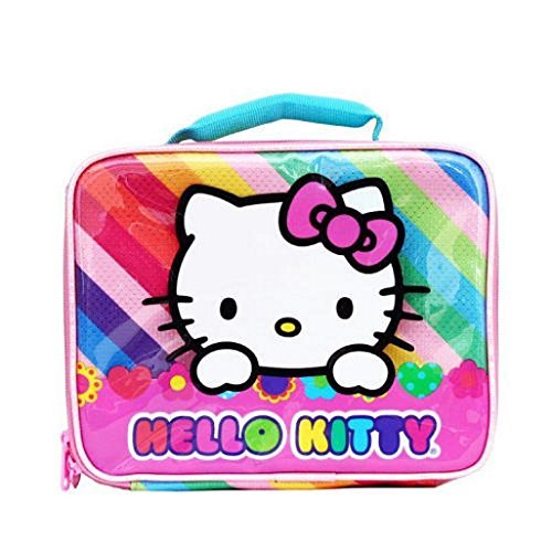 Lighweight ?Sturdy construction ?Fully zippered ?Padded carry handle ?Colorful Hello Kitty image with rainbow stripes