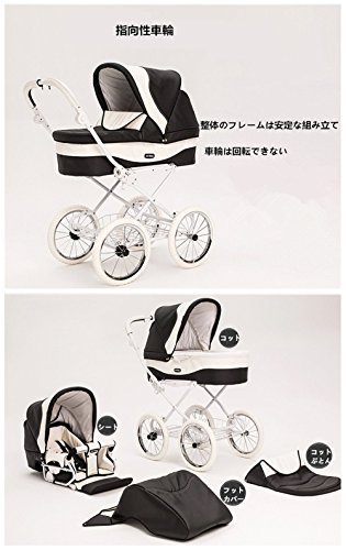 - ベビーコットの取り付け方向や3段調節(ワンタッチ式)で、お子様の顔を見ながらベビーカーを押すことが出来るなど様々なスタイルでご使用頂けます。シェード:上質なソフトレザーを採用することにより確かに日陰を作ります。多少の雨でも防水します。