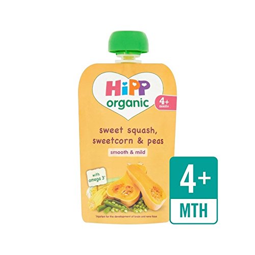 - HiPP Organic Sweet Squash, Sweetcorn & Peas Pouch 4+ Mths 100g (Pack of 4)