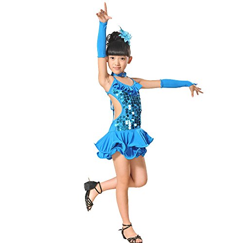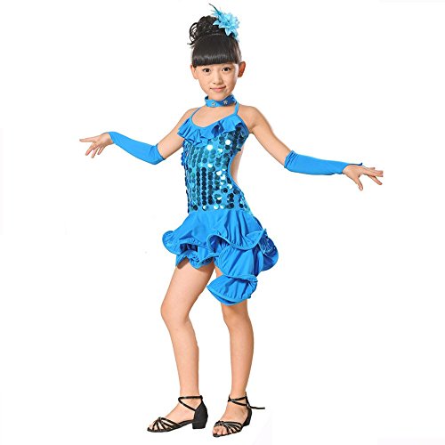 女児 ラテンダンス 練習 演出服 社交ダンス衣装 ラテンダンス衣装 スパンコール スパンコール ドレス ネックレス アームカバー 髪飾り 4点セット (130, ブルー)