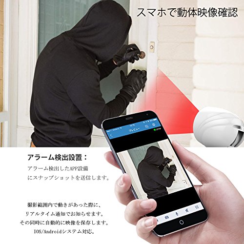 - 【動体検知、アラーム機能】スマホやタブレットなどでアプリに登録するだけ、 リアルタイムの監視画面をチェックできます。アラーム機能もありますので、撮影範囲内で動きがあった際に、インテリジェント警報が即時にお知らせでき、スマホのアプリにメール(撮った写真)を自動的に送信します。 リアルタイムの映像が確認できて、防犯対策・お家の見守り・老人介護・ペット/子供見守りとして役に立ちます。