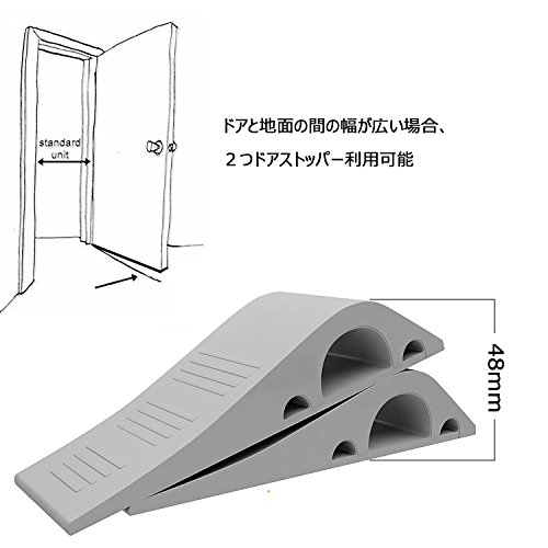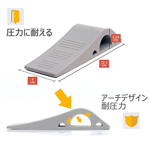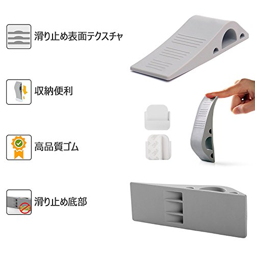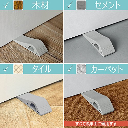 特徴 ●工具不要:インストールは簡単で、ドアと床のすき間にストッパーを差し込んで利用できます。 ●ドア止め:ドアをお好みの角度で固定する事ができます。ドアストッパーでドアを開けたままにさせ、赤ちゃんや子供やペットなどの安全を確保します。 ●滑り止め:ストッパーの凹凸が滑り止めで簡単に止まります。木材、タイル、コンクリート、PVC、カーペット、ストーン&その他のすべての表面に使用できます。 ●耐久性:ラバー製で耐久性と伸縮性に優れ、柔らかくてドアや床を傷つけない、粘着テープを使用すれば木製ドアにも簡単設置可能。 ●収納可能:使用しない時は蓋付きでドアストッパーを便利な場所に保ちます。 商品特徴: