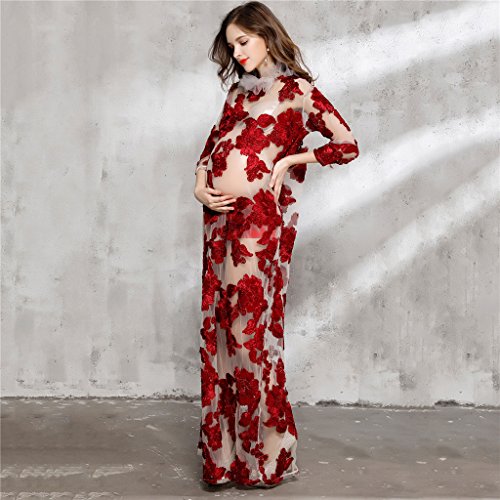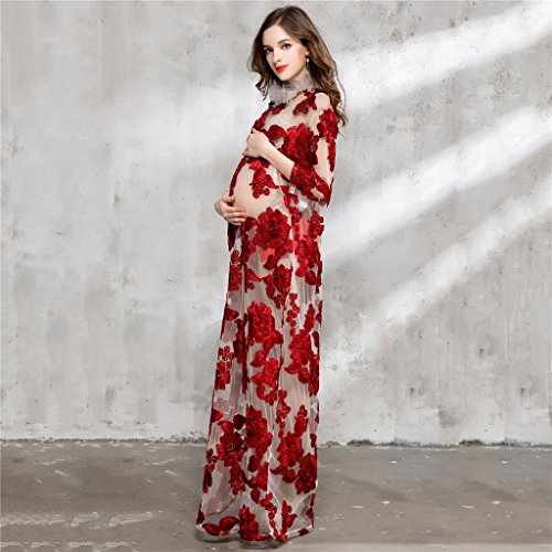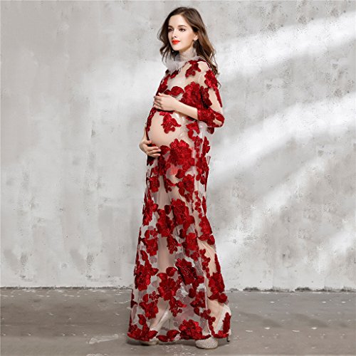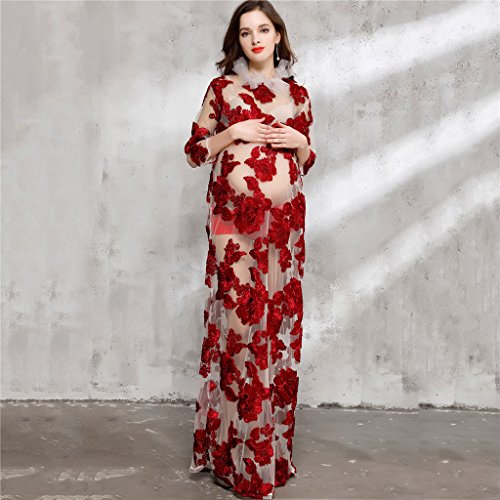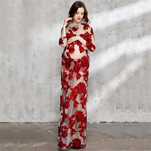 - シースルーメッシュ、長袖、全長から作られた妊娠中の女性のための豪華なマキシドレスは、大きな赤い花の刺繍、セクシーで魅力的な