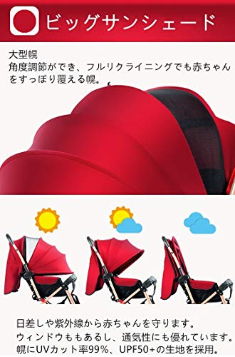 - 【ビッグサンシェード】角度調節ができ、フルリクライニングでも赤ちゃんをすっぽり覆える幌。日差しや紫外線から赤ちゃんを守ります。ウィンドウももあるし、通気性にも優れています。幌にUVカット率99%、UPF50+の生地を採用。