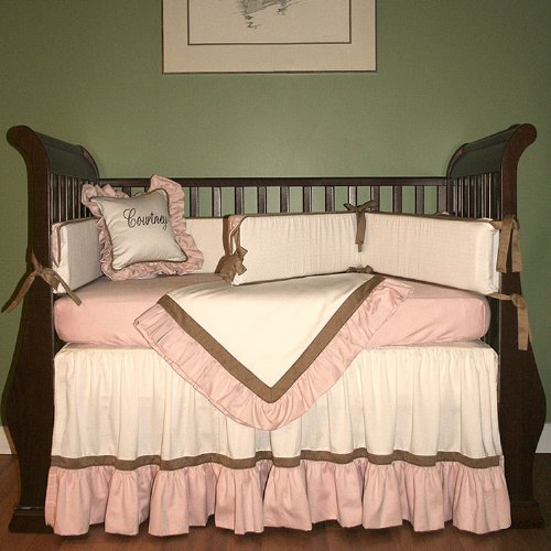 Made in the USA using designer fabrics;Unique, duvet style bumpers have zippered opening to remove bumper padding for laundering;Four piece set includes 18 drop crib skirt, bumpers, blanket and sheet;Machine washable