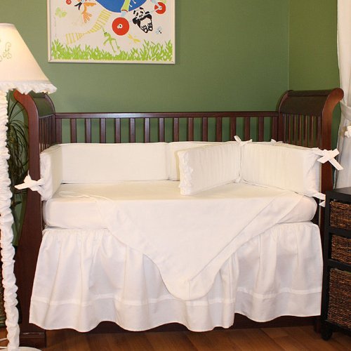 Made in the USA using designer fabrics;Unique, duvet style bumpers have zippered opening to remove bumper padding for laundering;Four piece set includes 18 drop crib skirt, bumpers, blanket and sheet;Machine washable
