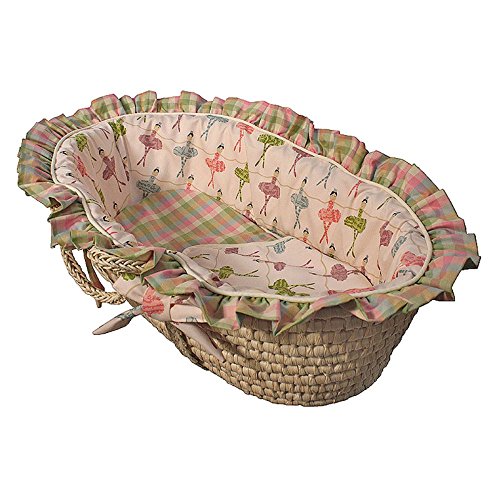 Ballerina-themed Moses basket for your newborn;Always carry baby and basket separately;Includes bumper, sheet plus cushion, and blanket;Woven basket with 100% cotton flannel bedding;Dimensions: 32L x 20W x 11H inches