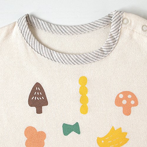• きのこや木の実、森などのさまざまなモチーフがプリントされたTシャツです。