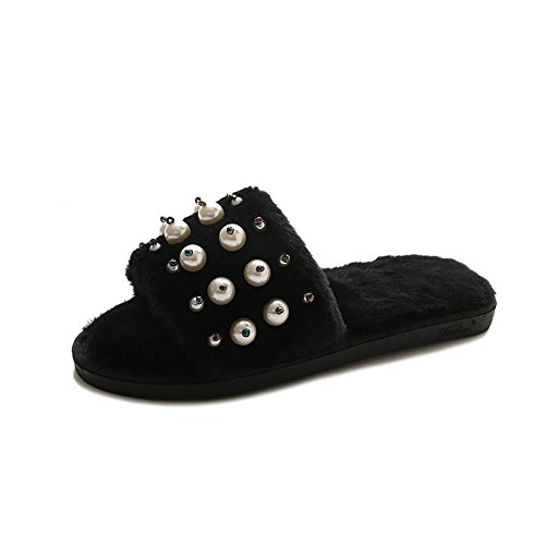 女子シューズ Hosam 可愛い靴 ルームシューズ ファー モコモコ スリッパ 柔らかい 暖かい (25-25.5cm, ブラック)