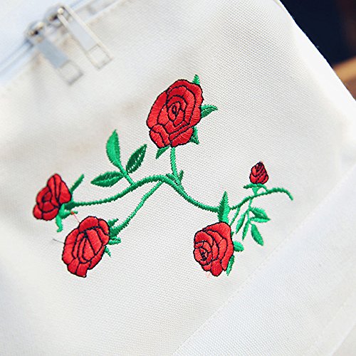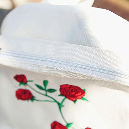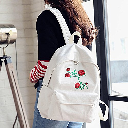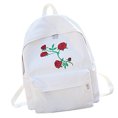 リュックサック Hosam バックパック レディースバック キャンバス素材 バラ刺繍 おしゃれ ファッション 中学生 高校生 大学生 お出かけ 通学 旅行などに対応 小物 携帯 タブレット ヘッドホン 収納 (ホワイト)