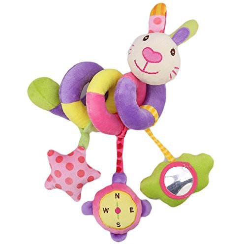 Color:Colorful Rabbit ,Material: Plush;Size:Length 34x21x4.5cm;Package included: 1 x Baby musical toy;Feature :1,Hanging toys have hidden features in them to help stimulate the senses through sight, touch and sound Includes 3 hanging toys with interactive sounds, including rattle, squeaker and baby safe mirror. 2,The product is designed with entertainment and ease of use in mind, whilst still stimulating your child's senses.;Vibrant colours, interesting patterns and hidden features all help to encourage baby to explore their toys, keeping you both calm when on your travels.