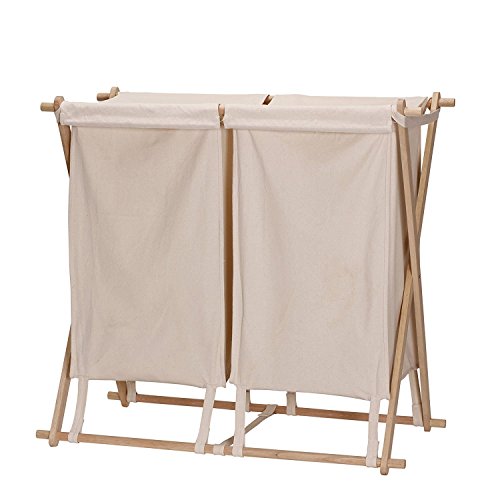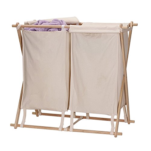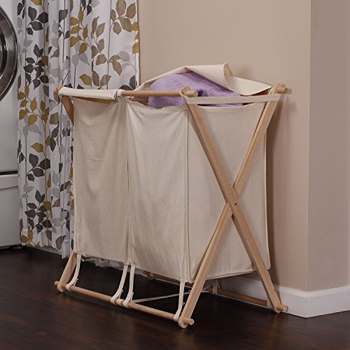Size:Double Sort, store, and haul laundry in Household Essentials x-frame wood double laundry hamper sorter, a large capacity double clothes hamper that holds approximately 4 loads of laundry!ツ? this spacious 2-bag hamper sorter simplifies laundry day by pre-sorting laundry.ツ? 2 polycotton canvas bags hang on the 30 inch wide frame.ツ? each cream colored bag, with drape lid that lays over the top of each side of the laundry sorter, hooks onto the raw wood x-frame.ツ? the bags latch on with fabric loops and then secure with additional hook and loop fasteners.ツ? the removable bags areツ? machine washable with like colors (line dry), making it easy to haul dirty laundry out of the hamper (bag and all), and then wash everything (bag included!).ツ? the unfinished frame can be stained or painted to match your space, making this double hamper sorter a versatile addition to your laundry routine.ツ? perfect for homes and shared living spaces!ツ? the x-frame wood double laundry hamper sorter is 30 inches tall, 30 inches wide, and 17 inches deep.