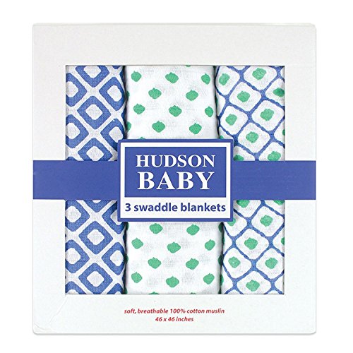 Color:Blue Hudson baby muslin swaddle blankets 3 pack is made of super soft cotton for the softest touch on baby's gentle skin for more peaceful sleeping. These blankets are generously sized at 46 x 46 inches for easier swaddling but can also be used as a nursing cover, tummy time, or stroller cover. Available in blue and pink, all blankets come in a cute box to make the perfect gift.