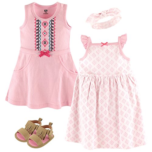HUDSON Babyリトルレディ夏のドレス、ヘッドバンド、靴のセットはの夏の衣装にぴったりこのセットには2ノースリーブドレス、、1ヘッドバンド、1組の靴をはいていた。ドレスは綿100 %スーパーソフト綿を使用しています。ヘッドバンドは、92コットン、8スパンデックスにフィット0 – 24ヶ月。愛らしいマッチング靴はソフトの屋内に最適靴底と滑り止めのボトムが含まれています。
